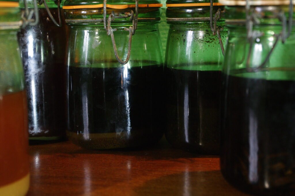Une teinture mère est obtenue par macération de plantes dans un mélange eau-alcool.