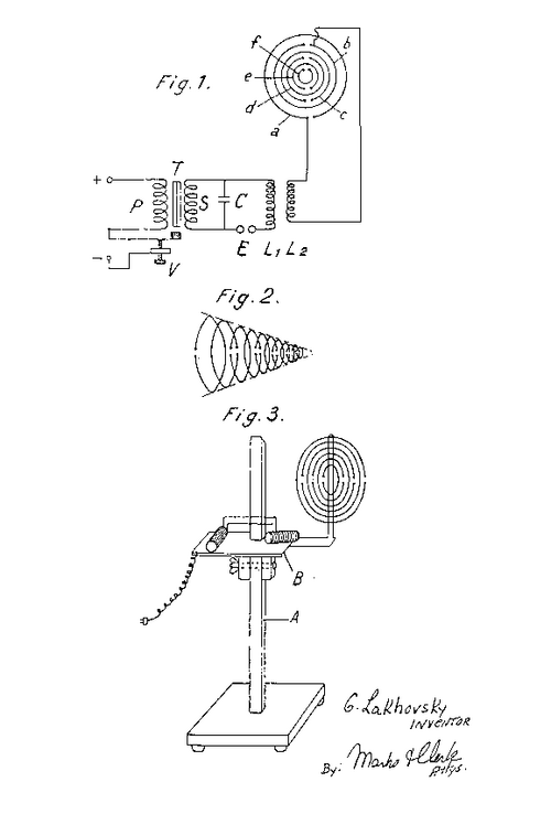 D’autre part, les modèles de Georges Lakhovsky, présentent une très forte induction. Le patient, reçoit donc une quantité d’ions négatifs, lesquels retournent à la terre via le patient. Il en résulte un «ruissellement électromagnétique » à la surface du corps (pour voir le chapitre).