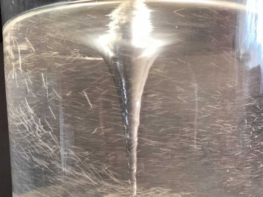 Lors de l’éjection dans la cuve, l’eau rejoint le mouvement de tourbillon, le vortex visible.