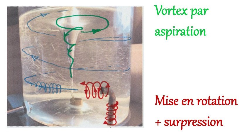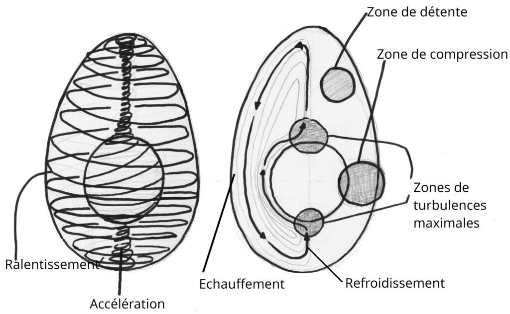 Ainsi, les rotations induites par le tuyaux, les micro-vortex, animent l’eau de la cuve qui vont, en se déformant rejoindre le centre et repartir pour un nouveau cycle.